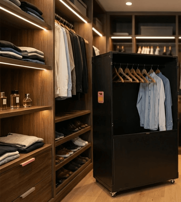 ארון נייד עם מוט תלייה, גלגלים לשינוע קל, דלת מגנטית וידיות אחיזה. מאפשר להעביר בגדים על קולבים – בלי לקפל, בלי קמטים.